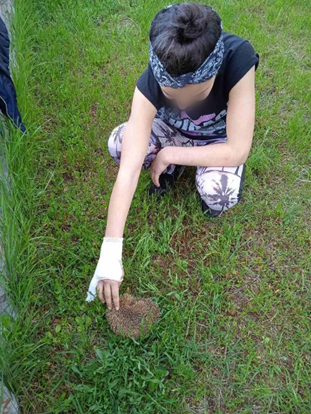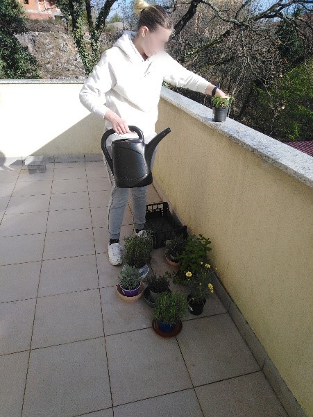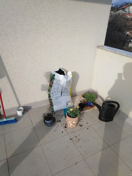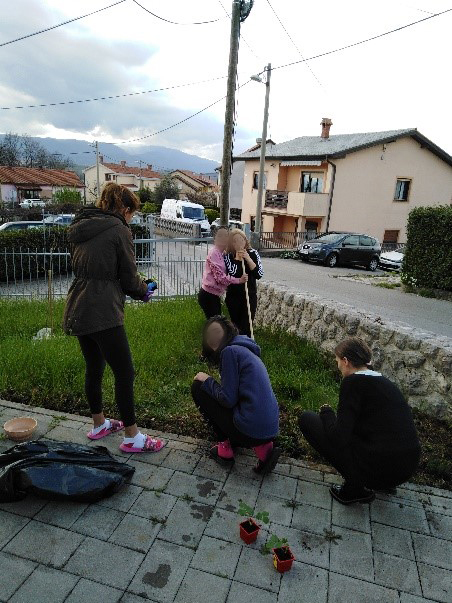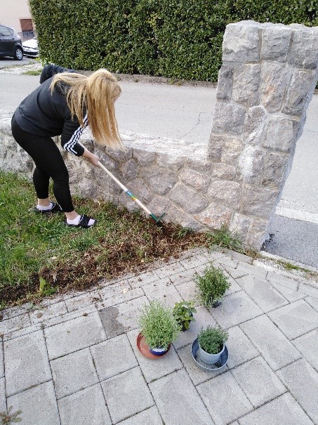 Oko kuće je mali travnati prostor gdje smo posadili cvijeće. Prvo smo se glupirale i govorile da se sramimo kopati i čupati travu, a kasnije smo bile ponosne na naš zajednički rad. Kasnije je naš vrt privremeno postao dom za jednog ježa.